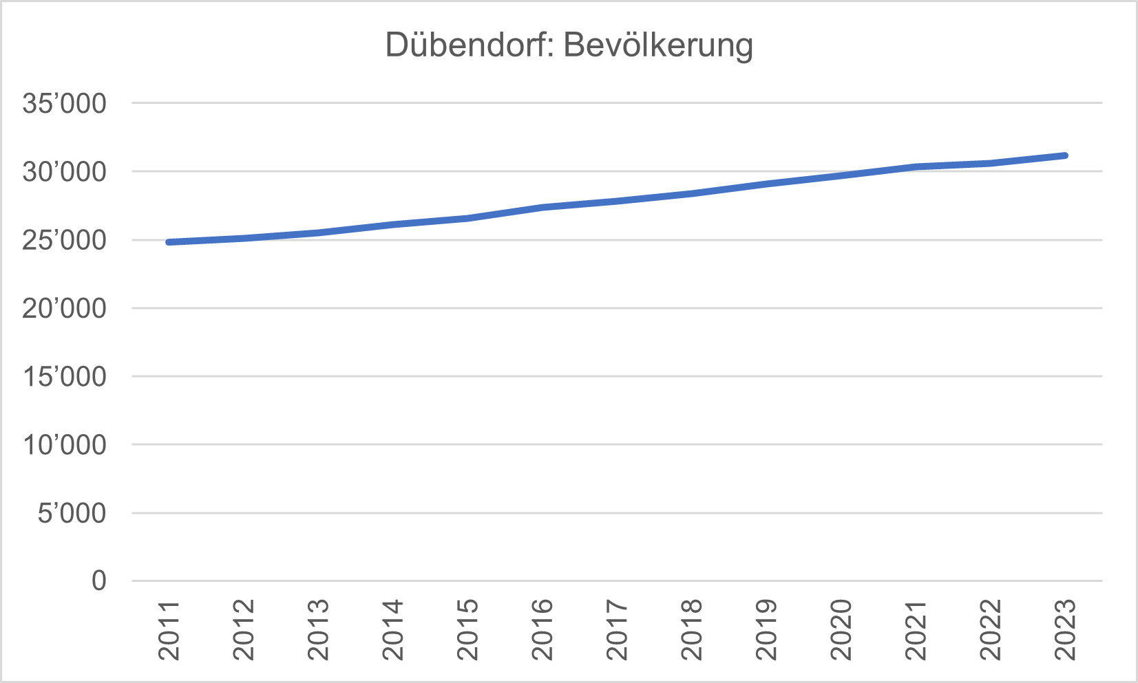 Im Jahre 2023 ist die Bevölkerung von Dübendorf um 597 Personen auf 31’186 gewachsen (nach zivilrechtlichem Wohnsitz). Damit lag das Wachstum etwas über dem Durchschnitt (531) der Jahre seit 2011. Voraussichtlich wird Dübendorf im 2024 stärker wachsen, da vermutlich gleich mehrere Überbauungen bezugsbereit werden.